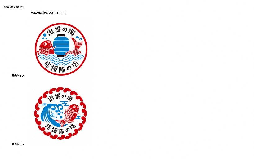 第1条 この要綱は、出雲の海応援隊(以下「応援隊」という。)のPR及び地産地消の推進を目的に、応援隊の隊員(以下「隊員」という。)が出雲の海応援隊の店ロゴマーク(以下「ロゴマーク」という。)を使用する場合に、必要な事項を定めるものとする。