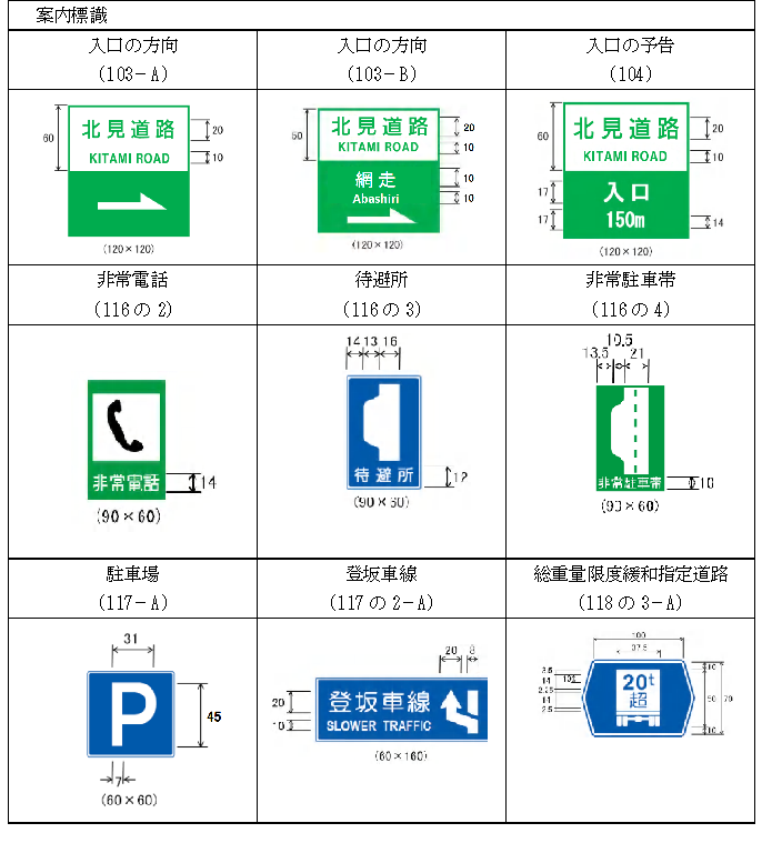 イ 道路に設置する案内標識で、「入口の方向」、「入口の予告」、「方面・方向及び道路の通称名の予告」、「方面・方向及び道路の通称名」、「著名地点の標示(114-B)」、「非常電話」、「待避所」、「非常駐車帯」、「駐車場」、「登坂車線」、「総重量限度緩和指定道路」、「高さ限度緩和指定道路(118の4-A・B)」、「道路の通称名」、及び「まわり道」を標示するもの以外のものの文字の大きさは、道路の設計速度に応じ、次の表の右欄に掲げる値(ローマ字にあっては、その2分の1の値)を基準とする。ただし、必要がある場合にあっては、これを1.5倍、2倍又は3倍に、それぞれ拡大することができる。