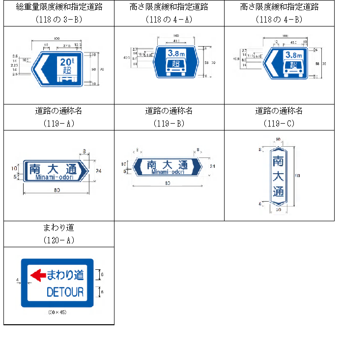 オ 道路に設置する「道路の通称名」を標示する案内標識については、表示する文字の字数により図示の横寸法(「道路の通称名(119-C)」を標示するものについては、縦寸法)を拡大することができる。