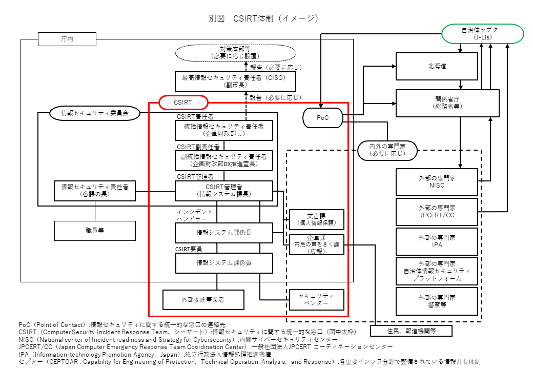 | CSIRT副責任者 | 副統括情報セキュリティ責任者 | 企画財政部DX推進室長 | CSIRT責任者が不在の場合に権限を引き継ぐ。 |